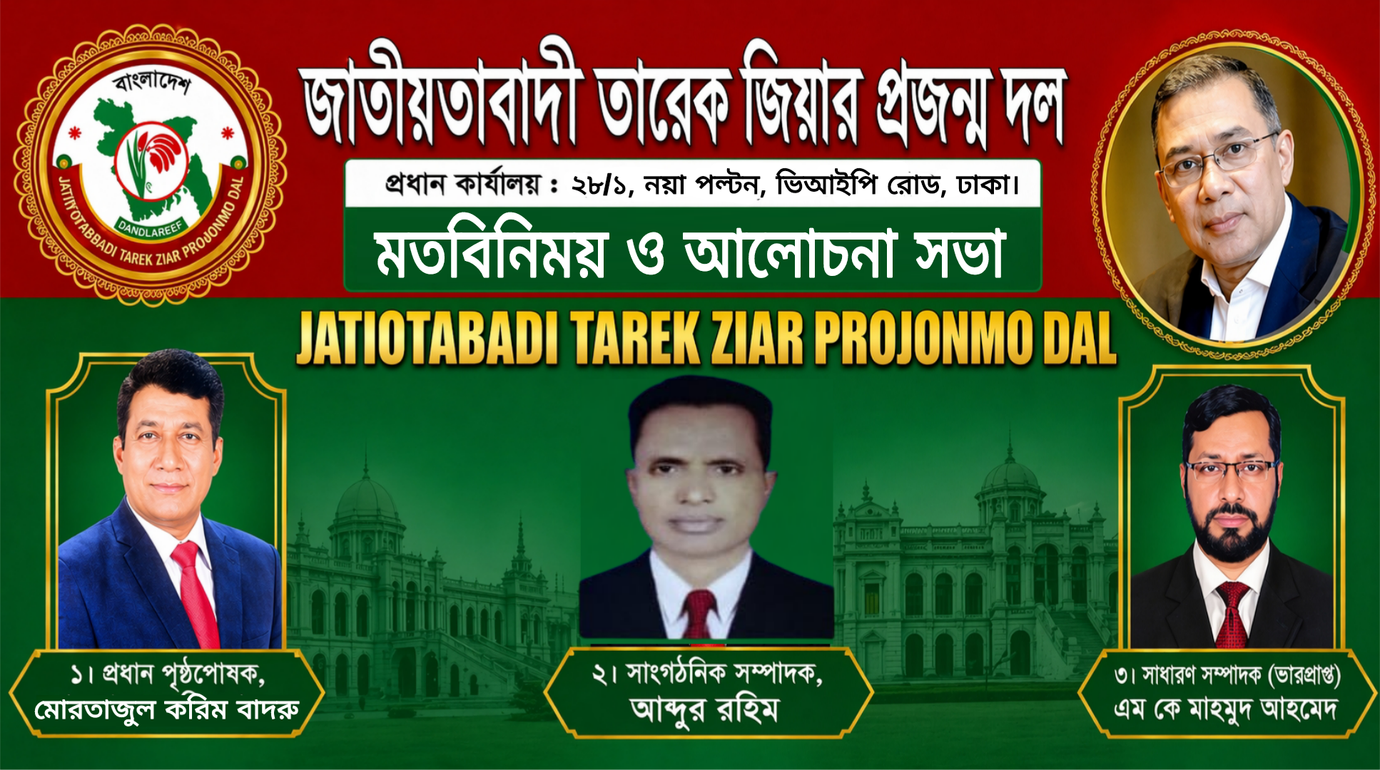 বাংলাদেশ জাতীয়তাবাদী তারেক জিয়া প্রজন্ম দলের কেন্দ্রীয় কমিটির উদ্যোগে আগামী ২৮ এপ্রিল ২০২৬, মঙ্গলবার একটি গুরুত্বপূর্ণ সাংগঠনিক মতবিনিময় সভা অনুষ্ঠিত হতে যাচ্ছে। দীর্ঘ ১২ বছরের নানা প্রতিকূলতা, নির্যাতন, নিপীড়ন ও হয়রানির অভিজ্ঞতা পেছনে রেখে সংগঠনটি নতুন উদ্যমে এগিয়ে যাওয়ার লক্ষ্যে এই সভার আয়োজন করেছে বলে সংশ্লিষ্ট সূত্রে জানা গেছে।